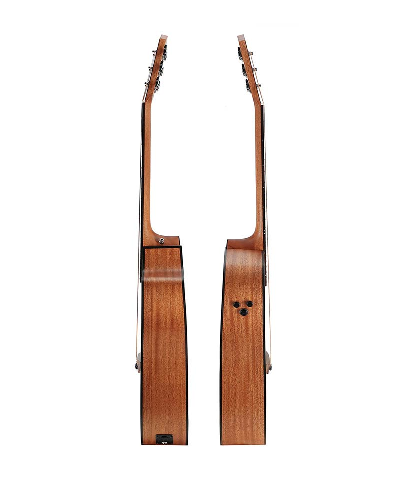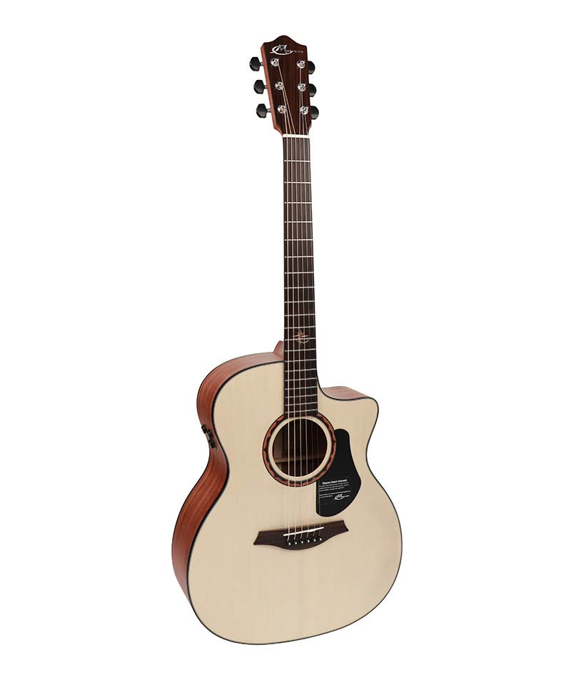 Chitarra acustica elettrificata a spalla mancante, modello marquis. Con piano armonico in cedro massello, fondo, fasce e manico in mogano, tastiera e ponte in palissandro indiano. Dotata di un sistema di elettrificazione piezo attivo Mayson MPC-1 e di un'elegante e pratica borsa imbottita.