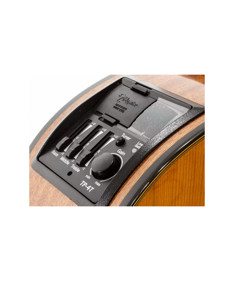 Il comodo manico in mogano con tastiera in Laurel indiano forniscono suonabilit e feeling ottimi, mentre il preamplificatore Takamine TP-E offre un accordatore integrato con controlli di volume e tono ed un interruttore mid-cut per prestazioni amplificate eccellenti.