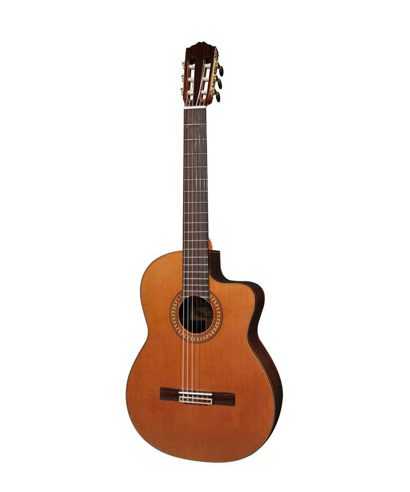 La Salvador Cortez CC-60CE unachitarra classica amplificata a spalla mancantedi livello superiore, realizzata in cedro massello canadese di alta qualit e fasce e fondo in palissandro. Elettrificata con un sistema di preamplificazione piezoelettricoFishman ISYS-Tcon accordatore incorporato in grado di restituire facilmente un suono naturale.
