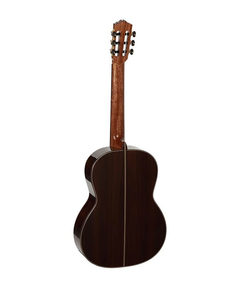 Chitarra flamenco negra con piano armonico in abete Engelmann massello, fondo e fasce in palissandro massello, tastiera e ponte in ebano, capotasto e traversino in osso, catenatura di tipo tradizionale fan bracing. Dotata di un'elegante e robusta borsa imbottita deluxe.