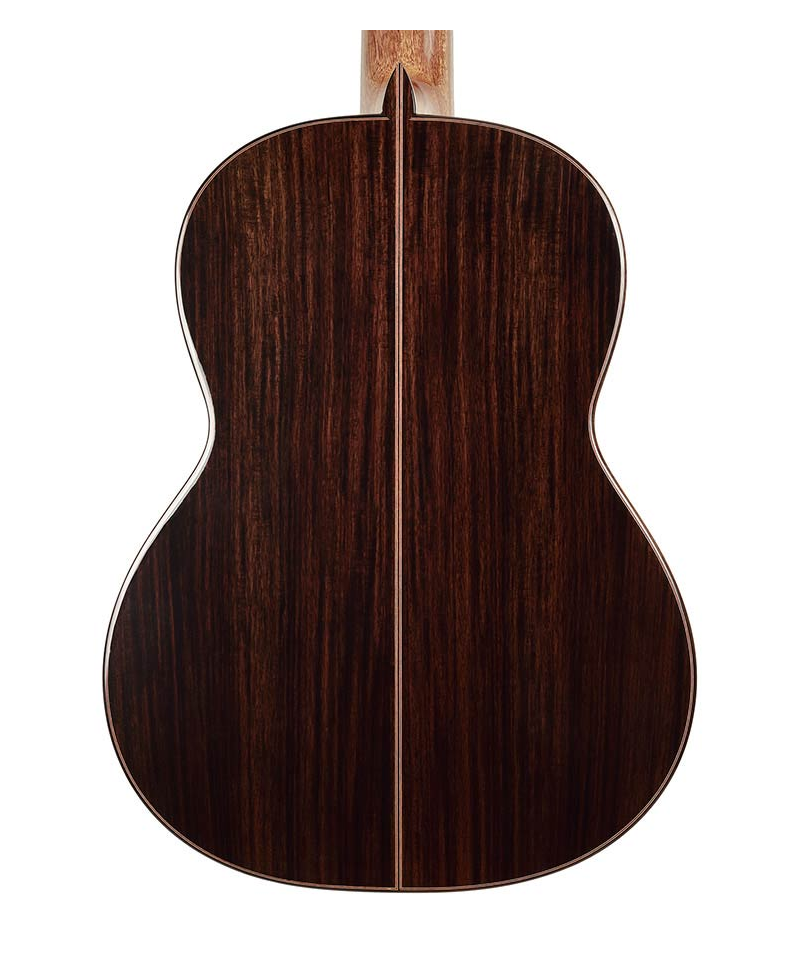 Chitarra classica 4/4 con tastiera rialzata con piano armonico in abete Engelmann massello, fondo e fasce in palissandro massello, tastiera e ponte in ebano, capotasto e traversino in osso, catenatura moderna lattice bracing. Dotata di un'elegante e robusta borsa imbottita deluxe.