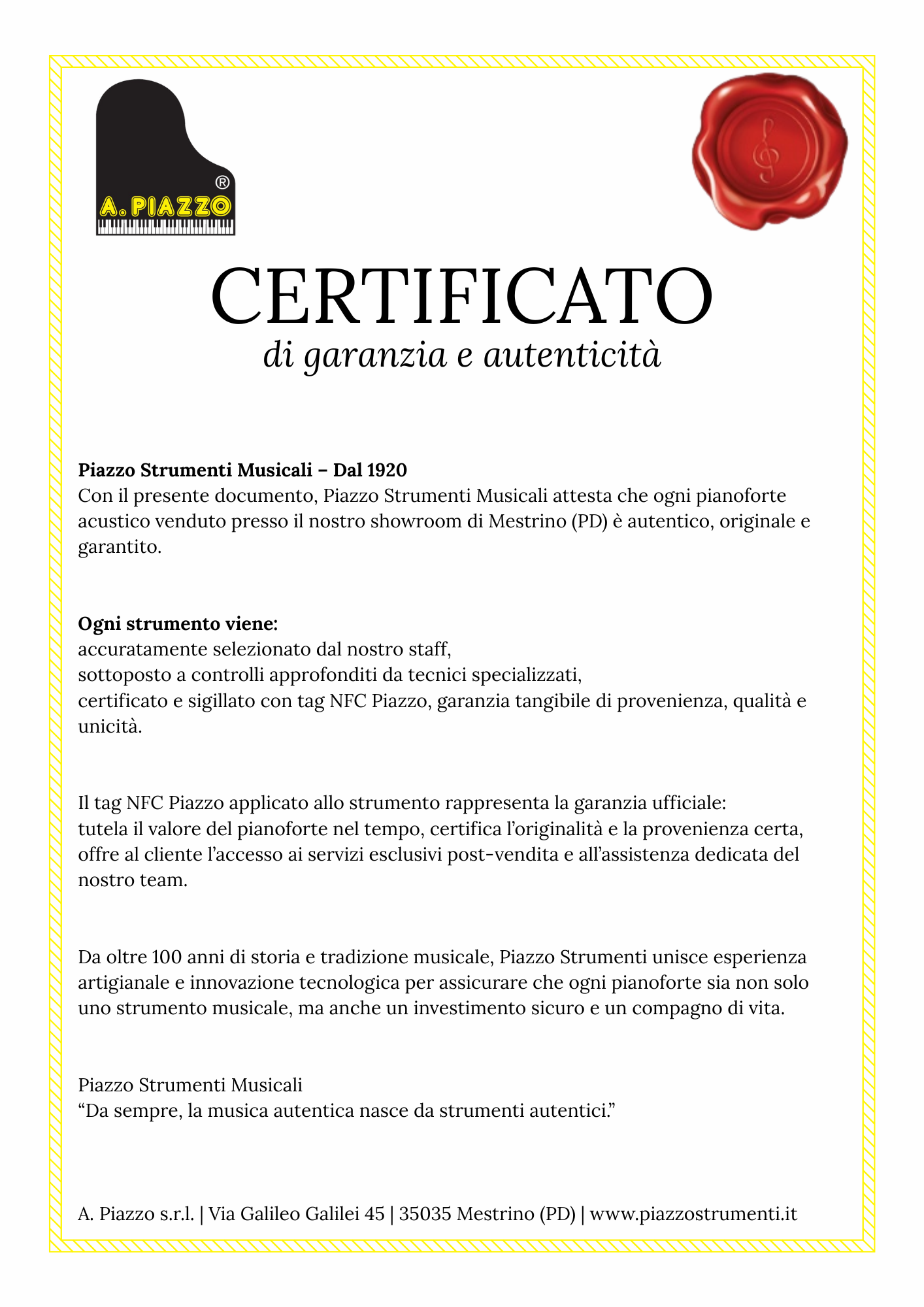 Solo i pianoforti Piazzo originali sono dotati di tag NFC certificato, applicato esclusivamente presso il nostro punto vendita di Mestrino (PD). - Originalità e unicità