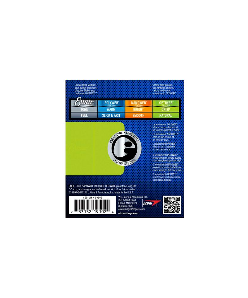 Grazie alla tecnologia Optiweb, Elixir offre corde per chitarra elettrica più sensibili e naturali. Destinate ai chitarristi che vogliono la stessa sensazione ed il suono di una corda non rivestita, le corde per chitarra elettrica Optiweb sono progettate appositamente per consentire alla corda di vibrare liberamente. Inoltre offrono una presa precisa sulle corde, che i chitarristi apprezzano per il bending e le tecniche di vibrato