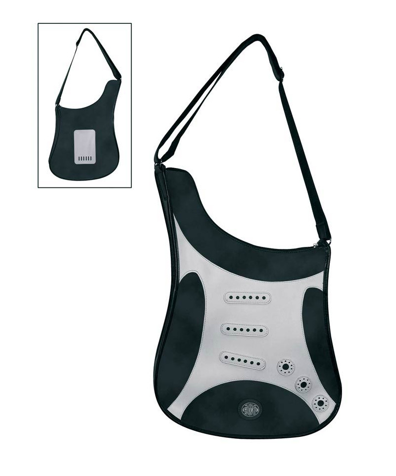 Borsa sagomata, in vinile, modello Stratocaster, nera e bianca.
