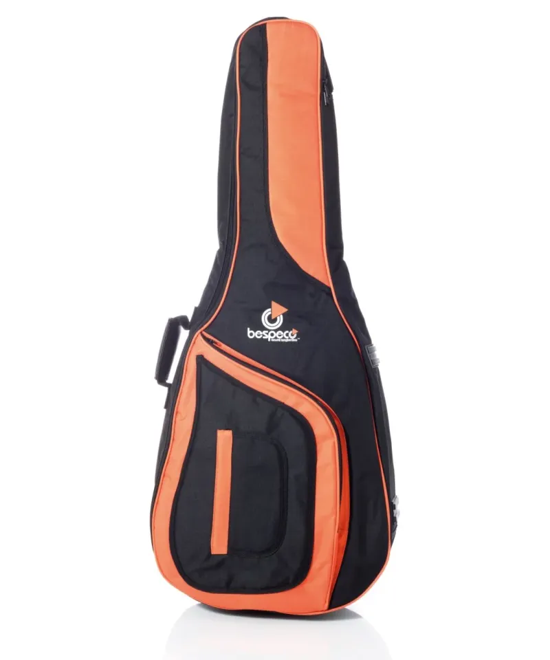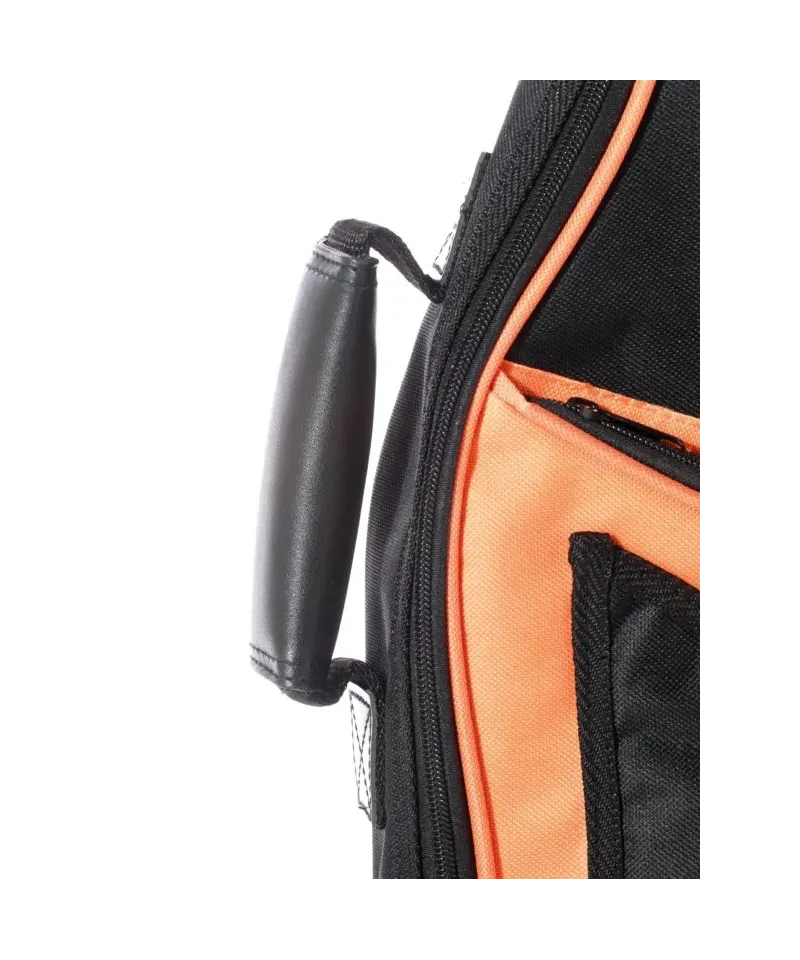Borsa morbida serie Training LinePer chitarra classica, con imbottitura da 10 mm. Realizzata in “Oxford cloth 600D” antistrappo e bordatura in PVC, colore nero + arancione. Maniglia imbottita. Tracolla doppia regolabile con moschettoni professionali e ampia tasca frontale. Gommini paracolpi in gomma naturale. Robuste cerniere lampo cucite con nylon antistrappo. Rinforzo interno a protezione di corde e ponte.
