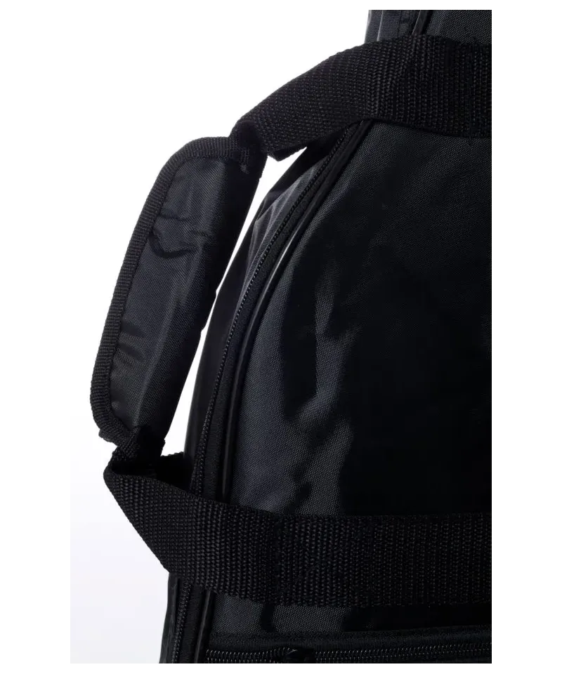 Borsa morbida serie Young Line per chitarra elettrica. Realizzata in Nylon 420D antistrappo e bordatura in PVC, colore nero. Maniglia rinforzata con chiusura a strappo in velcro. Tracolla doppia regolabile e ampia tasca frontale. Robuste cerniere lampo cucite con nylon antistrappo. Gancio posteriore.