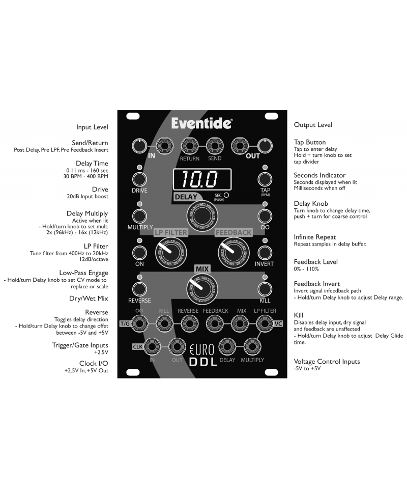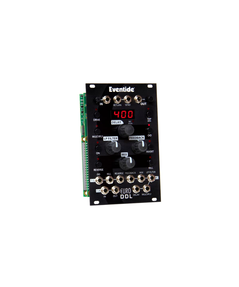 Progettato per le prestazioni, EuroDDL offre il controllo esterno di ogni caratteristica e funzione. Inoltre è stato progettato per suonare meno digitale rispetto al ritardo medio. Il design della vecchia scuola di Eventide limita rigorosamente la quantità di circuiti digitali solo a ciò che è necessario per il ritardo. La saturazione morbida, il filtro passa basso, il feedback, l'insert loop e il boost di +20 dB sono tutti analogici. Una volta ascoltato, capirai perché questo è il ritardo Eurorack definitivo e musicale. Per essere un vero strumento performante, tutti i controlli del modulo eurorack devono essere controllabili a distanza. L'EuroDDL fa proprio questo con i jack per accettare tensioni di controllo e trigger. È progettato per essere suonato come uno strumento. Ed è progettato per "suonare bene" nel rack con Return / Send e Clock In / Clock Out.