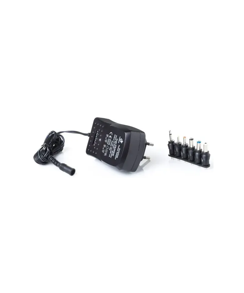 Alimentatore switching stabilizzato 500 mA multi tensione da parete, con serie di adattatori in dotazione per molteplici connessioni.