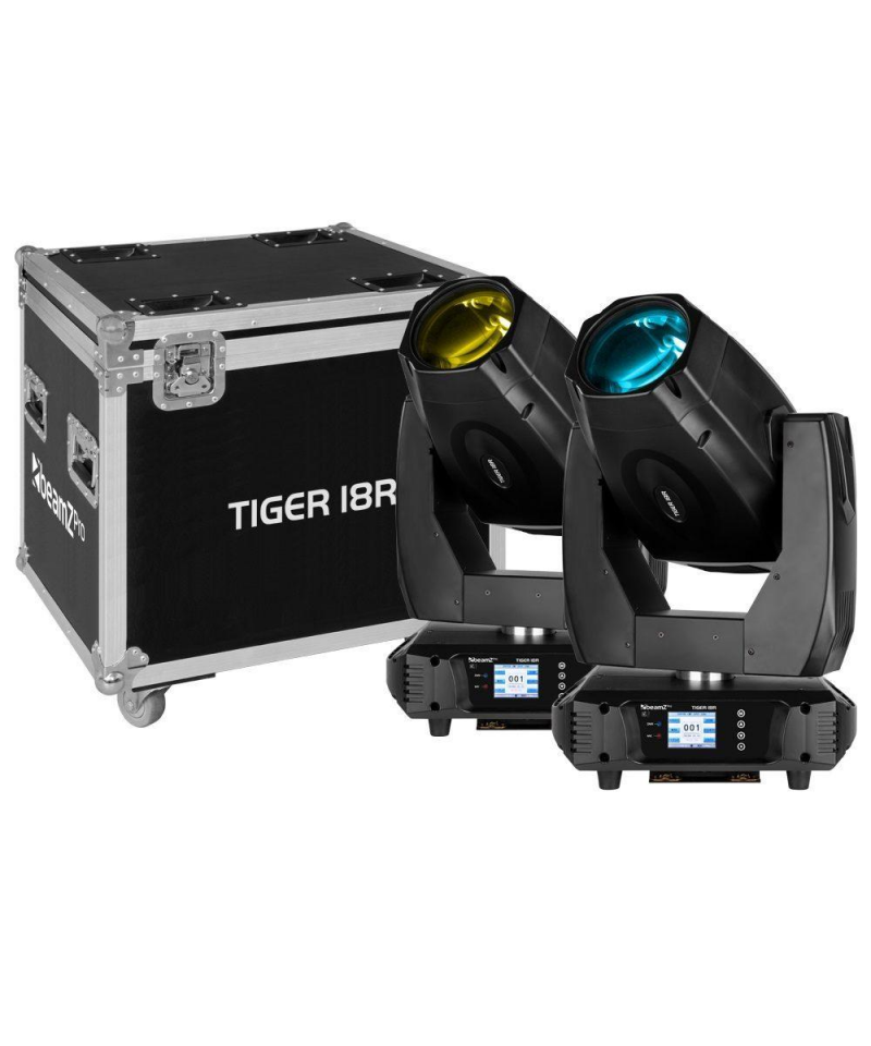 Un kit di 2 teste mobili professionaliTiger 18R 3in1, fornite in una solida e robusta flight case. Tiger 18R offre tre effetti:Beam, Spot e Wash ed dotato di una lampadina a scarica ad alta intensit 18R 380W. Ha anche una ruota colore (CMY Colors), frost, gobo e doppio effetto prisma per il massimo controllo. Funziona sia in modalit DMX che stand-alone. Quando si opera in modalit DMX, si ha il controllo completo con 23 o 26 canali DMX. Tra le sue caratteristiche ci sono un otturatore meccanico e uno strobo a velocit regolabile, filtro antigelo, prisma di rotazione, messa a fuoco motorizzata e dimmer meccanico