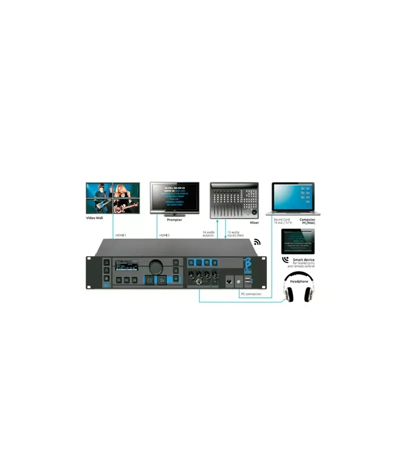 - Gestione sequenze multitraccia: Riproduce backing tracks audio in perfetta sincronia con video e immagini.
