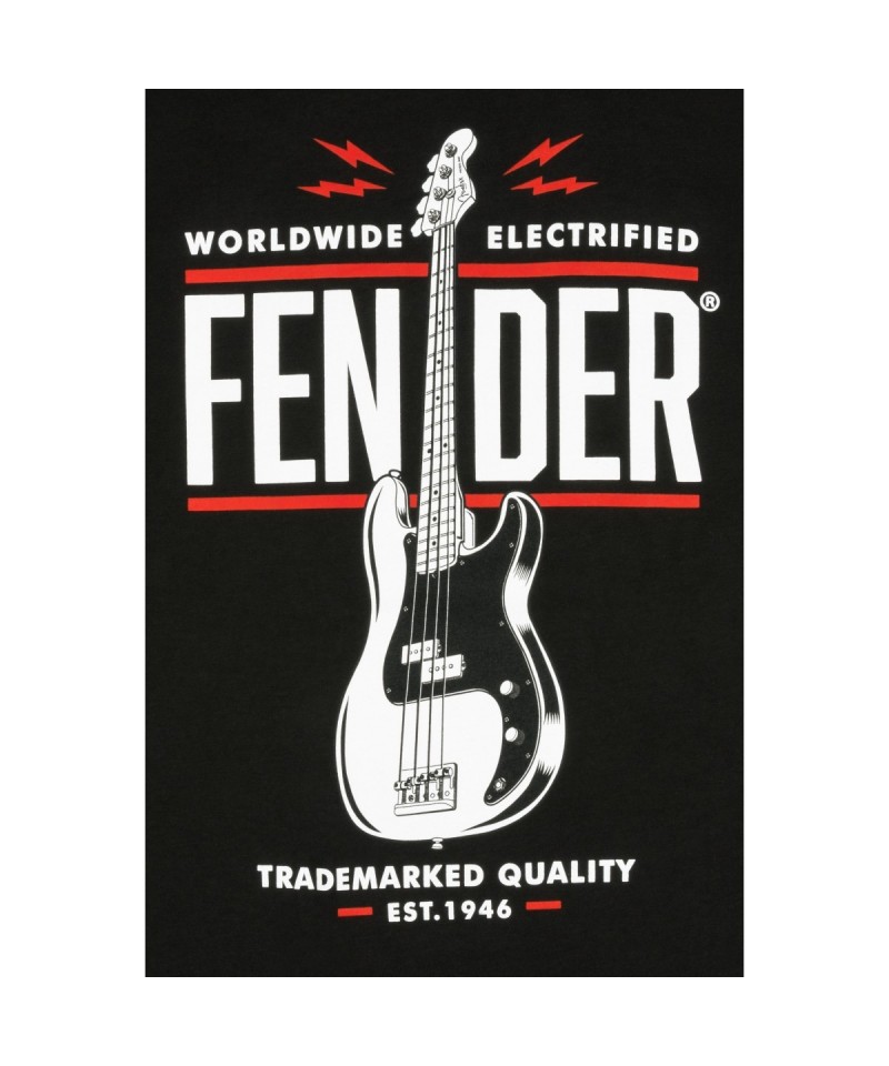 Celebra l'influenza duratura del P Bass® con questa t-shirt. Questa elegante maglietta porta un'immagine sorprendente del basso elettrico originale, insieme agli slogan "Worldwide Electrified" e "Trademarked Quality Est. 1946. " Non c'è modo migliore per celebrare la fascia bassa.