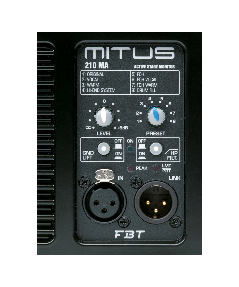 - Pannello di controllo con XLR input e link, volume, presets, filtro-HP, ground-lift