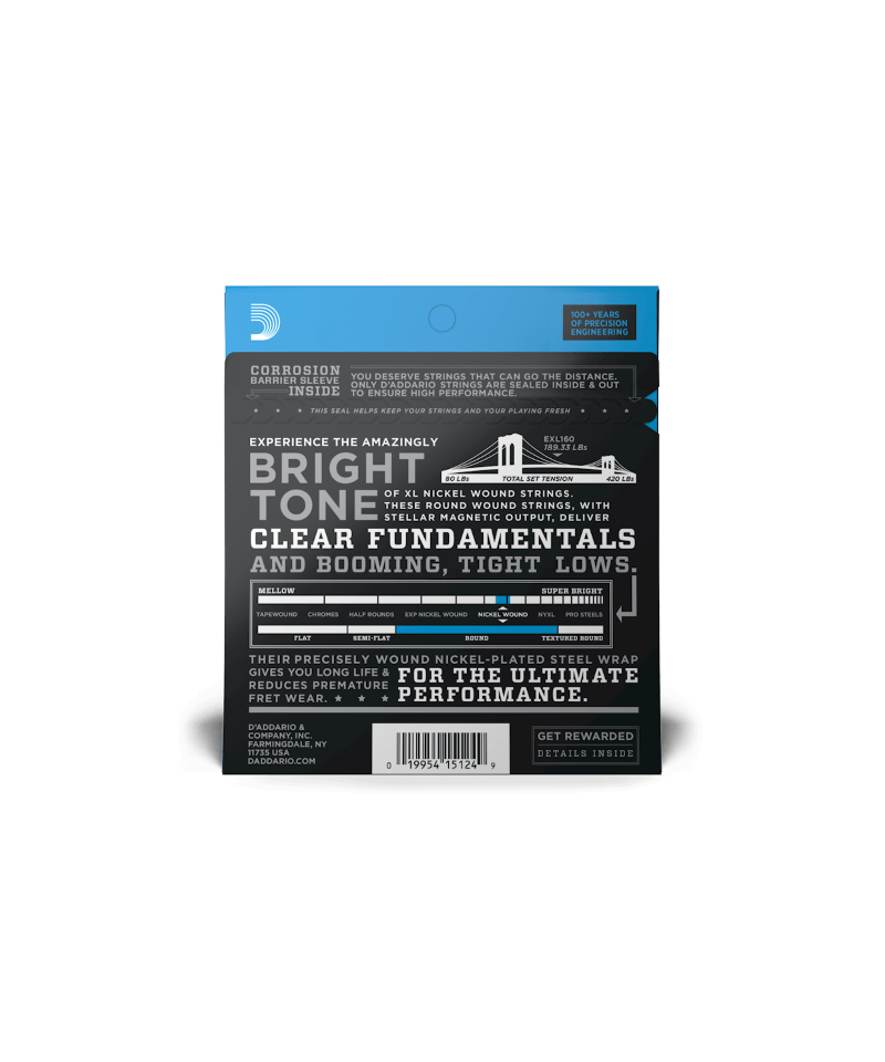 Le D'Addario XL Nickel Wound strings per basso elettrico sono rinomate nel mondo come "la scelta dei musicisti di tutti i generi e gli stili musicali". Le XL hanno un rivestimento di precisione in acciaio nichelato su un nucleo a forma di esagono: come conseguenza le corde hanno un caratteristico tono brillante ed una intonazione eccellente.