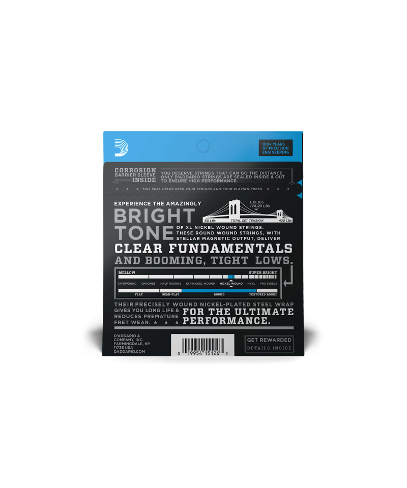 Le D'Addario XL Nickel Wound strings per basso elettrico sono rinomate nel mondo come "la scelta dei musicisti di tutti i generi e gli stili musicali". Le XL hanno un rivestimento di precisione in acciaio nichelato su un nucleo a forma di esagono: come conseguenza le corde hanno un caratteristico tono brillante ed una intonazione eccellente.