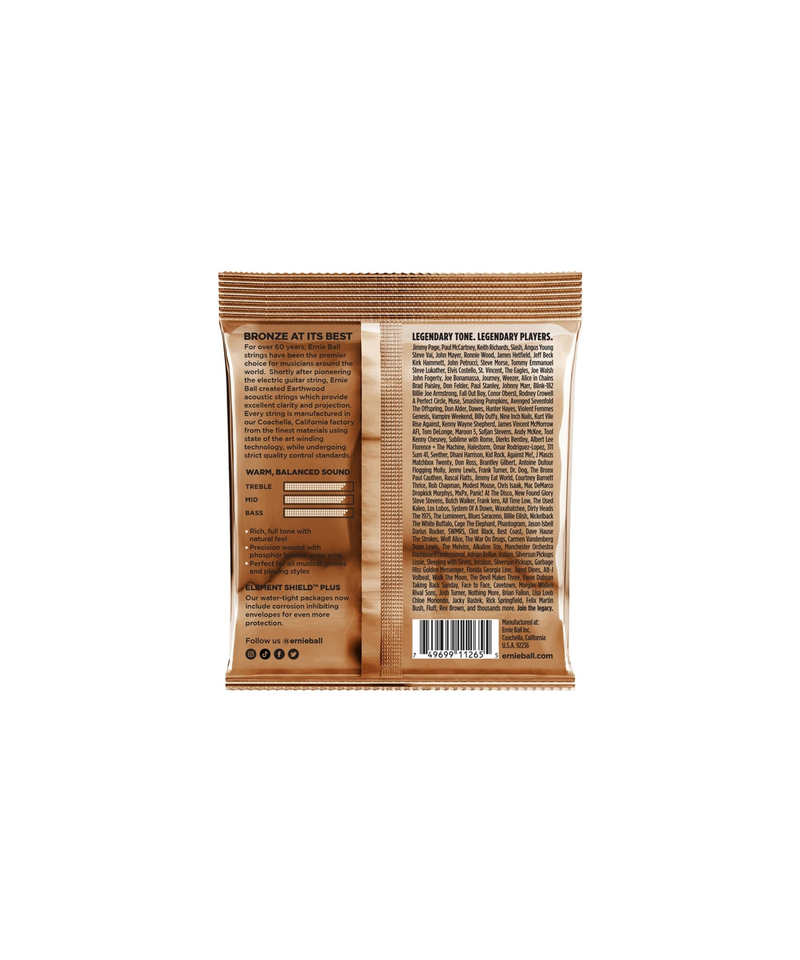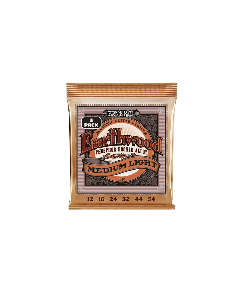 3546 è il pack da tre set di corde phosphore bronze per chitarra acustica della serie Earthwood con scalatura 12-54 di casa Ernie Ball. Sono costruite con un filo al 92% in rame, 7,7% stagno, 0,3% fosforo avvolto attorno ad un'anima esagonale in acciaio placcata a stagno. Queste corde per chitarra hanno una colorazione arancio chiaro/oro e offrono un suono pastoso e squillante, dall'eccellente chiarezza.