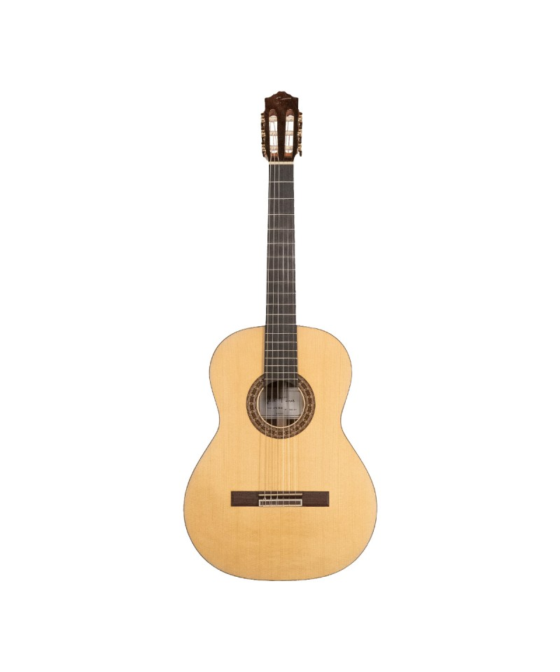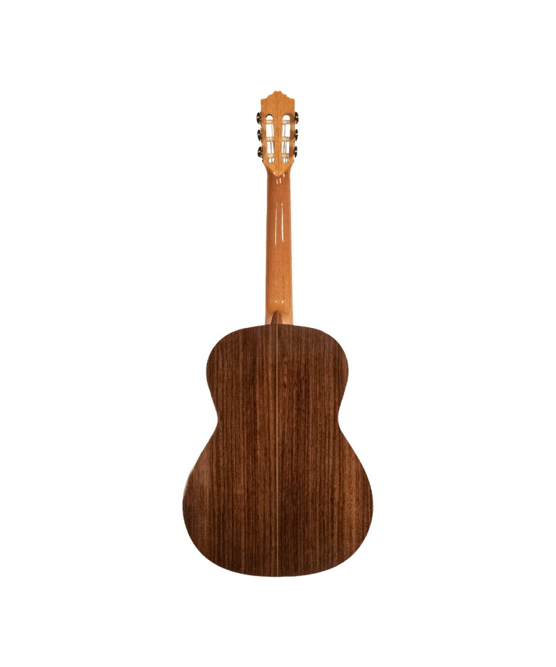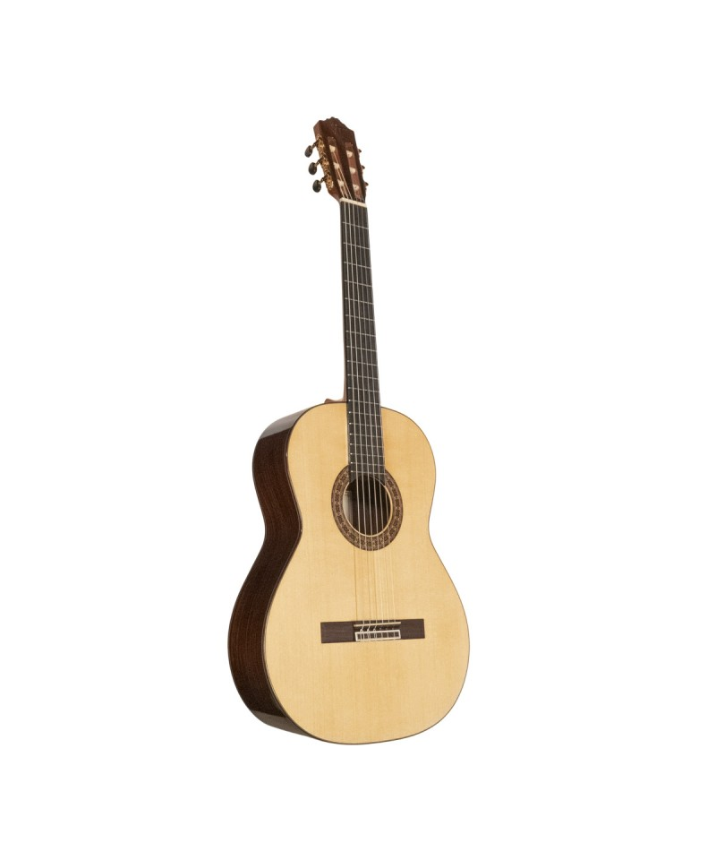 Questo modello fedele alla chitarra classica spagnola originale. E' totalmente tradizionale nel design e nello stile della costruzione, ed offre un suono classico e caldo. La parte posteriore le fasce sono realizzate in palissandro indiano massello, mentre la parte superiore composta da tavole armoniche di alta qualit accuratamente scelte. Queste caratteristiche danno un suono penetrante ma piacevole allo stesso tempo. Anche il comfort eccezionale, la sua suonabilit notevole e l'action delle corde accuratamente regolata. Contiene un trussrod regolabile all'interno del manico per evitare i problemi di curvatura. |