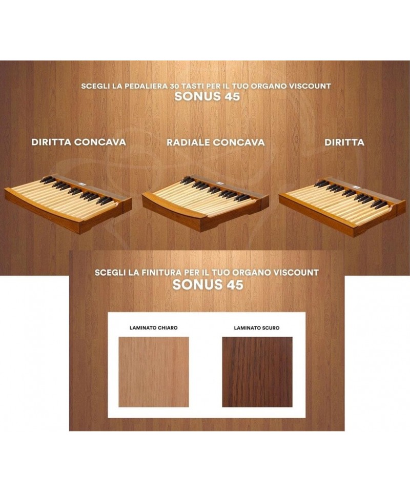 Il più ampio suono d'organo nella più piccola consolle con tecnologia Physis®! Grazie al suono proveniente dal basso, dallalto, dai lati è possibile simulare le riflessioni multiple delle pareti, del soffitto e del pavimento di un grande ambiente riverberante. Il nuovo sistema 'Pipe-organ real audio rendering' (con 6.1 canali e 9 altoparlanti) proietta lorganista al centro della scena per una nuova e coinvolgente esperienza sonora. Disponibile con mobile con finitura in legno di rovere (Sonus 45 Dlx) o finitura in melaminico (Sonus 45).