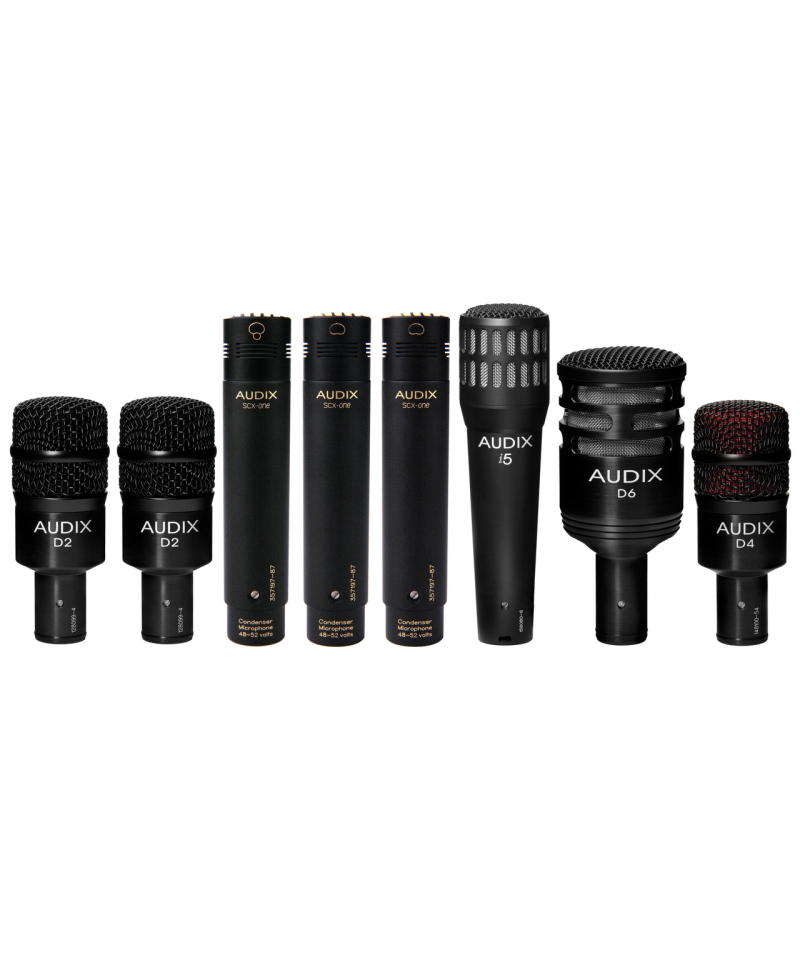 - 1x D6 microfono cassa, 1x i5 microfono rullante, 2x D2 per tom, 1x D4 per timpano, 2x SCX1C microfoni overhead, 1x SCX1HC microfono hi-hat