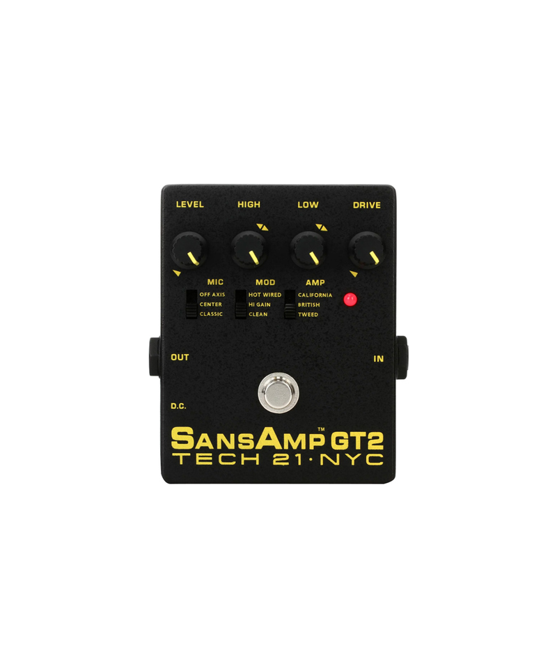E' estremamente facile creare impostazioni preferite. Ci ha molto a che fare con la natura dei tre switch di voicing a 3 vie del GT2. Prima di tutto, puoi scegliere tra gli stili di amplificatori valvolari, scegliendo tra l'iconico suono tweed americano, il classico drive inglese o un aggressivo suono high-gain in stile Californiano. Quindi, scegli tra la configurazione di valvole di serie, un gain boost che otterresti se avessi lanciato un 12AX7 extra nel tuo preamplificatore o un modello di amplificatore hot-rod con uno scoop della gamma media. Infine, puoi scegliere il posizionamento del tuo microfono virtuale, con la scelta tra un suono classico full range o il microfonaggio ravvicinato sia al centro che fuori asse. Completalo con un EQ a 2 bande altamente efficace e una vasta gamma di gain e drive, e non c' da meravigliarsi che SansAmp GT2 sia stato soprannominato lo stompbox originale dell'esercito svizzero