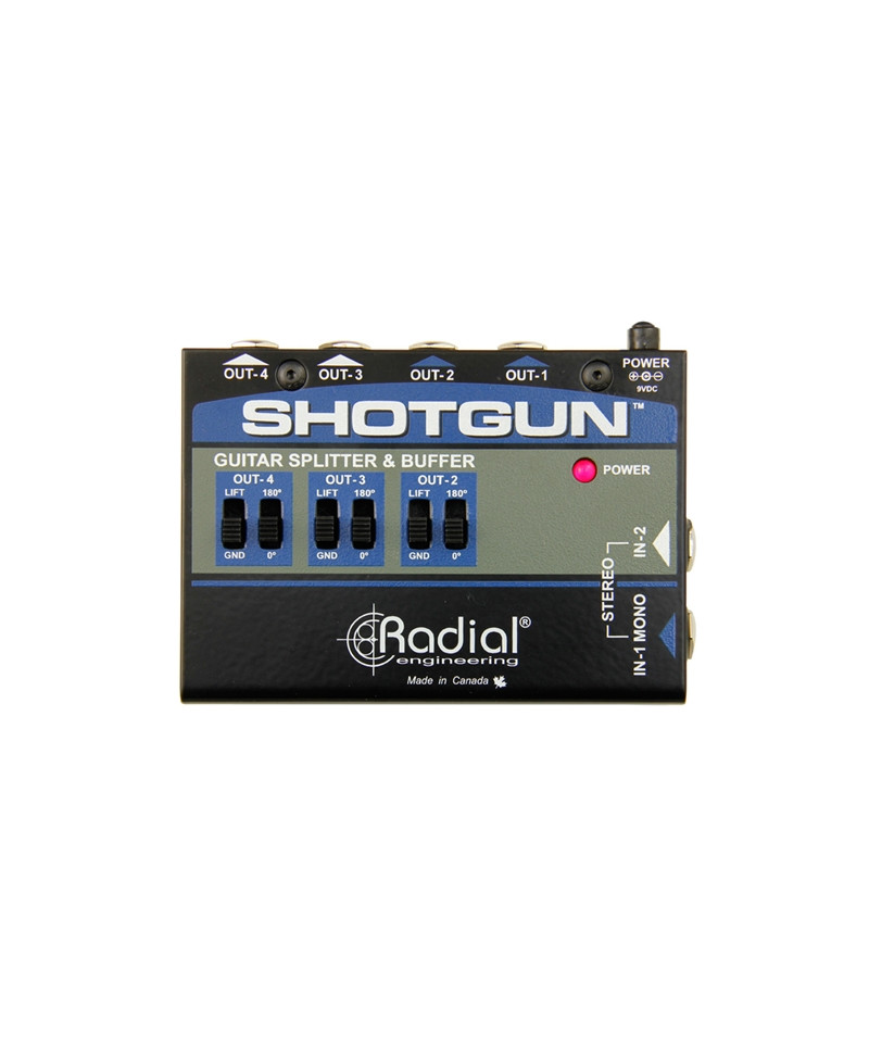 Progettato per segnali strumentali Hi-Z, Shotgun può essere configurato per l'utilizzo mono con un ingresso che gestisce quattro uscite o in stereo con due ingressi che gestiscono due coppie di uscite. Ogni uscita è bufferizzata singolarmente per abbassare l'impedenza e ridurre la propensione al rumore. Questo permette anche di gestire il segnale a distanze ragguardevoli durante l'esecuzione sui palchi più grandi. Output-1 è l’uscita predefinita che fornisce un percorso messo a terra in sicurezza per la chitarra mentre le uscite 2, 3 e 4 sono isolate per eliminare gli sgradevoli ronzii dei loop di massa quasi sempre presenti quando si utilizzano più amplificatori sul palco. Sono presenti inoltre degli interruttori individuali integrati per il Ground-Lift. Quando viene utilizzato come dual ovvero 1 x 2 splitter, l’innovativo circuito Constant Load Correction (CLC™) di Radial interviene per garantire l'impedenza della chitarra che permette al timbro di rimanere coerente.