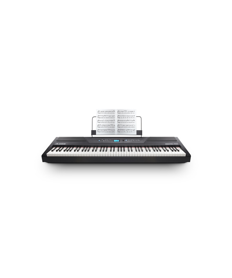 Alesis Recital Pro un pianoforte digitale con una tastiera 88 tasti hammer-action di dimensioni standard (full-size) con risposta al tocco programmabile dallutente e polifonia di 128 note. 12 sono i suoni integrati: piano acustico e piano acustico Bright, piano elettrico, vibrafono, organo, organo a canne, clavicembalo, clavinet, synth, string, basso acustico e basso elettrico. In modalit Layer, potrai miscelare due distinti suoni per creare un suono unico pi accattivante. Nel modo Split potrai invece assegnare due distinti suoni a differenti zone della tastiera, per suonarne uno con la mano sinistra e laltro con la mano destra. Sono disponibili 12 preset di modulazione specificatamente dedicati ai vari strumenti, oltre a riverbero e chorus (8 preset ciascuno), presa per il collegamento di un pedale sustain (non fornito in dotazione) e altoparlanti amplificati (30W). Alesis Recital Pro offre una funzione chiamata Lesson Mode che suddivide la tastiera da 88 tasti in due zone configurate con lo stesso timbro e la stessa intonazione, per consentire allinsegnante e allallievo di eseguire insieme gli esercizi didattici sullo stesso strumento. Nel Recital Pro grazie alla funzione Record Mode potrai registrare le tue performance per poi riascoltarle. Presente anche unuscita cuffia su jack TRS da che, una volta collegata la nostra cuffia, disabiliter lamplificazione integrata per allenarti senza disturbare. Luscita stereo su connettori jack da consente il collegamento audio dello strumento a registratori, mixer, o altri sistemi di amplificazione esterni. Collegando la porta USB presente nellAlesis Recital Pro al vostro computer potrete suonare via MIDI i software installati sui vostri computer, dai virtual instrument ai software di apprendimento o di notazione. La tastiera si alimenta da corrente, usufruendo delladattatore incluso, oppure mediante 6 pile tipo D (dette anche torcia) non incluse nella confezione.
