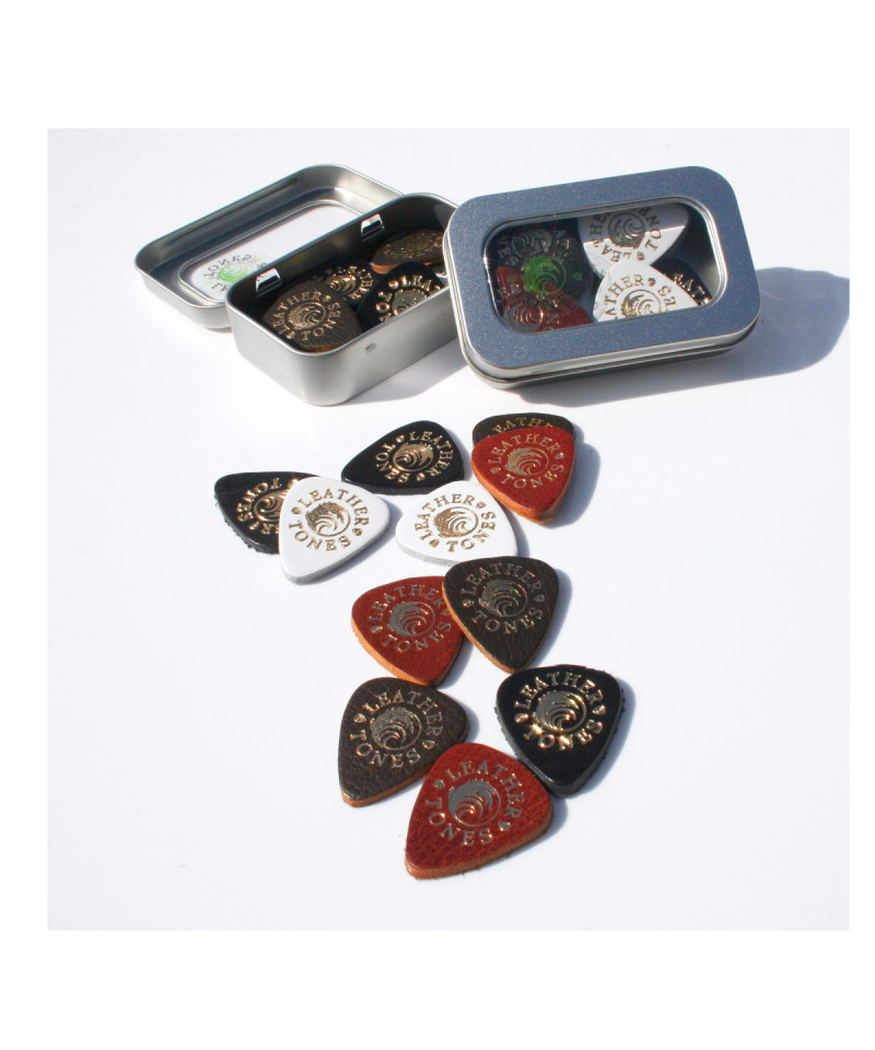 Confezione da 20 plettri in cuoio Leather Tones, realizzati appositamente per ukulele, con quattro differenti tipi di spessore e durezza di cuoio (nero, bianco, rosso-mattone, marrone).