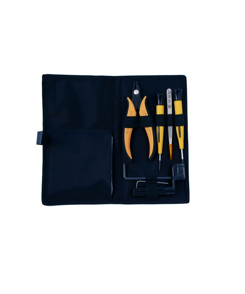 - Composto da :- 1 trousse- 1 pinzetta con punte robuste e presa zigrinata- 1 giravite ergonomico con lama a taglio- 1 giravite ergonomico con lama a croce- 1 tronchesina di precisione lame acciaio impugnatura in gomma- 1 chiave brugola 1,5- 1 chiave brugola 4- 1 tiracorde