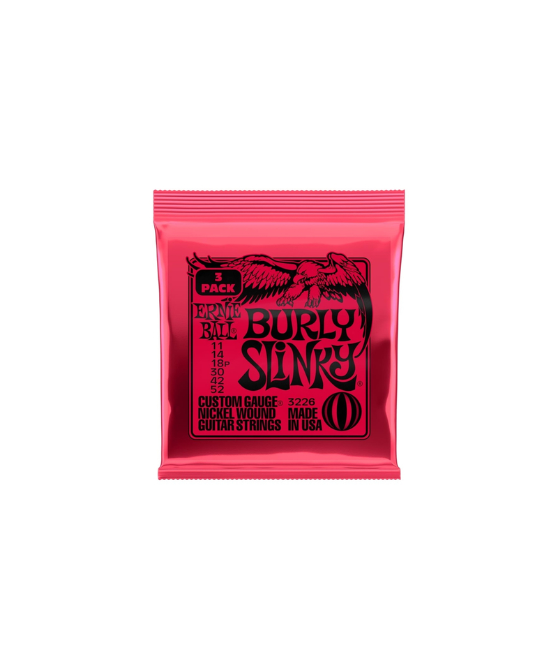 3226 è il pack da tre set di corde per chitarra elettrica della serie Burly Slinky Nickel Wound con scalatura 11-52 di casa Ernie Ball. Sono costruite con un filo di acciaio nichelato avvolto attorno ad un'anima esagonale di acciaio stagnato. Le corde lisce sono costruite in acciaio temprato stagnato ad elevato contenuto di carbonio, e producono un suono ben bilanciato.