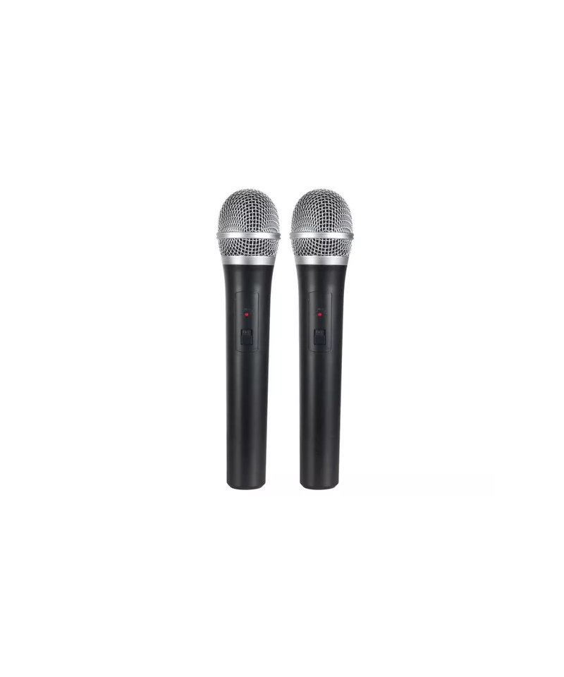 Sistema di microfoni wireless VHF a due canali con due microfoni palmari. I due trasmettitori lavorano a frequenze diverse. Ottima qualità del suono e affidabilità grazie alla tecnica VHF. Ideale per il palcoscenico, cantanti, presentazioni, ecc.