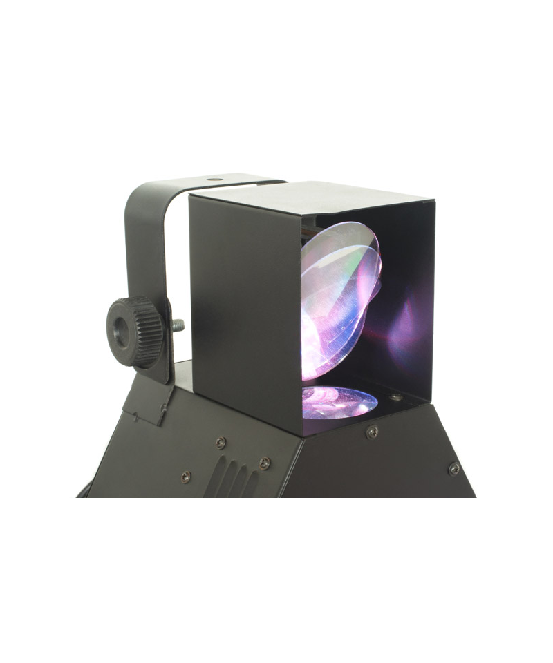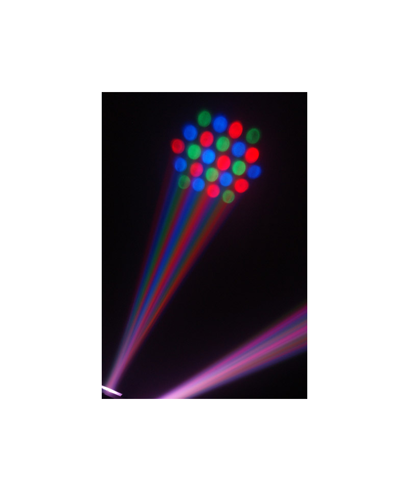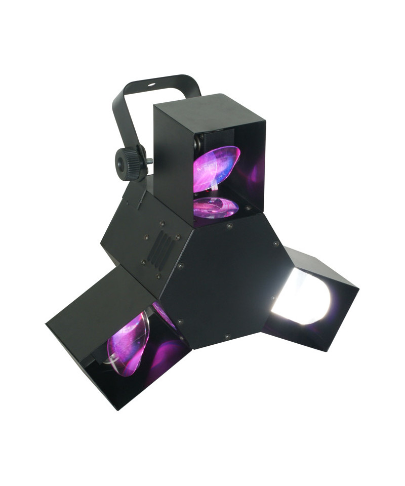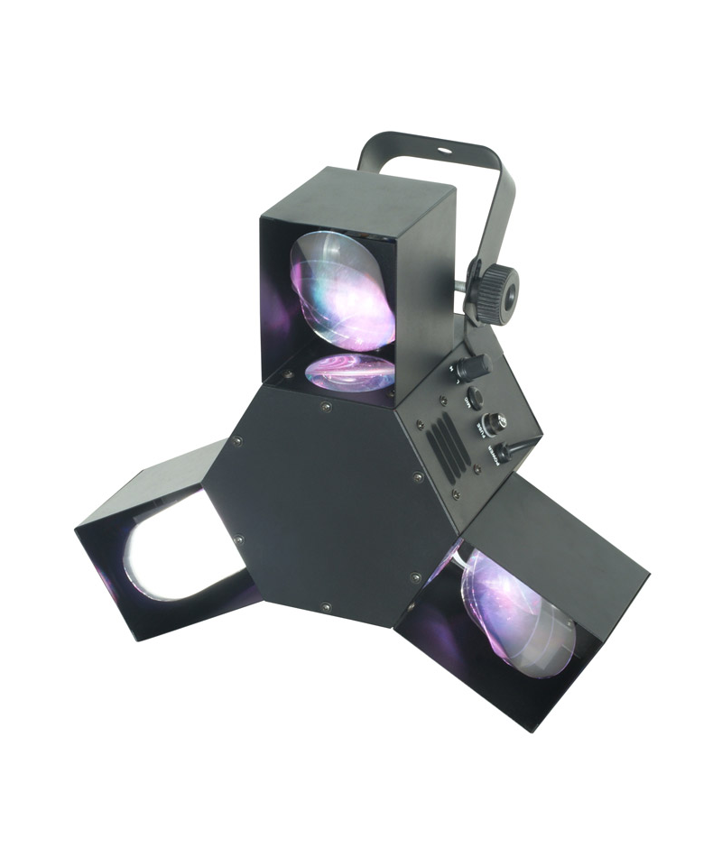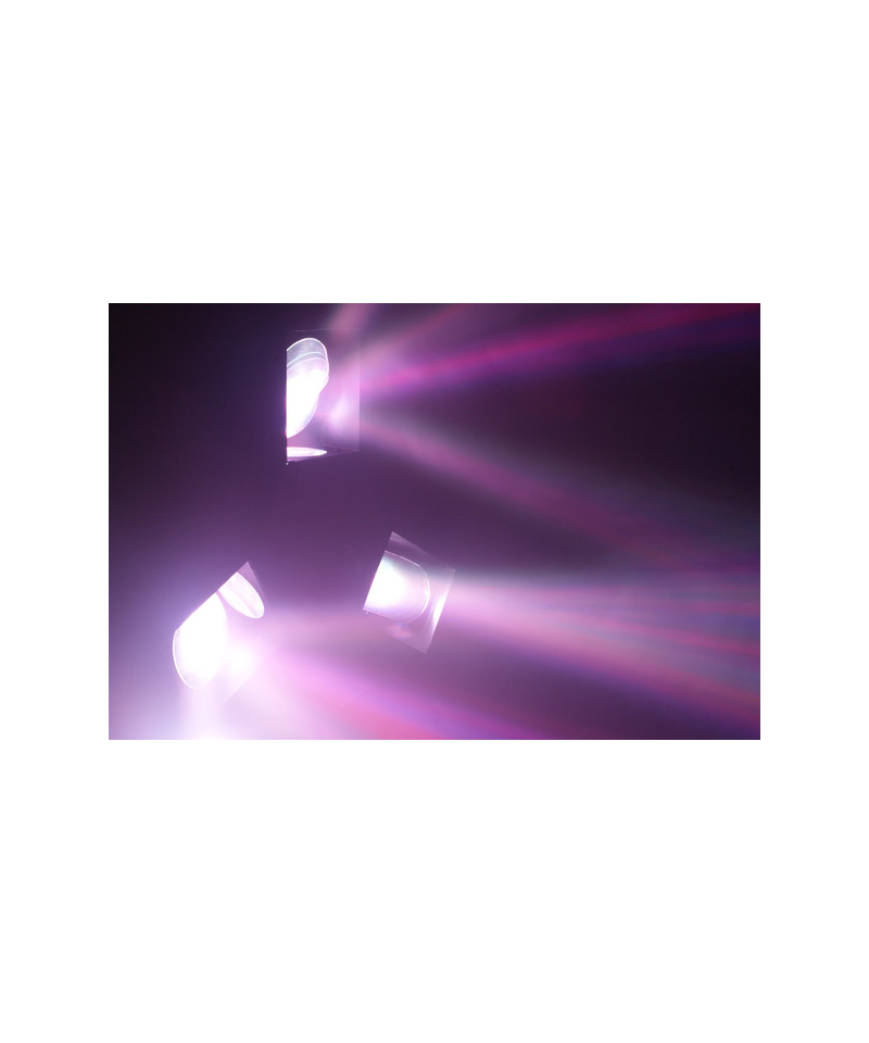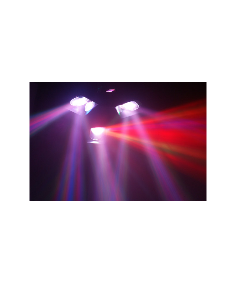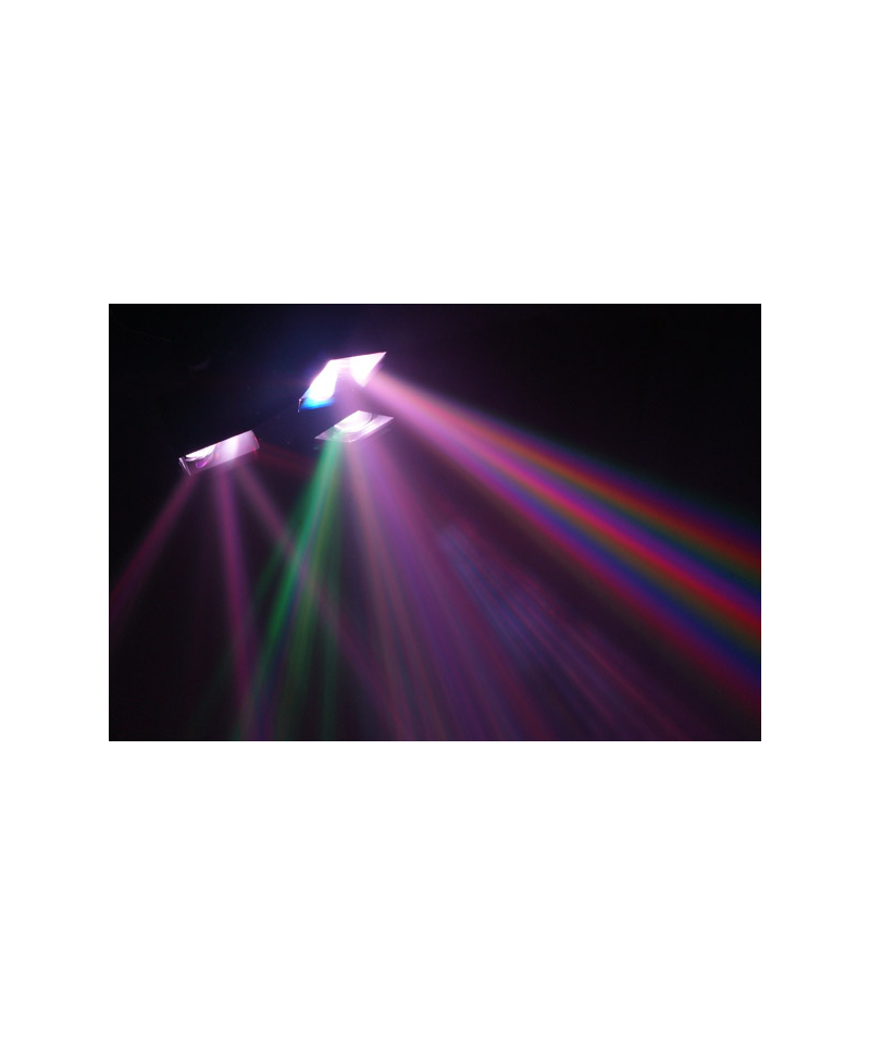 Effetto DMX Triple Flex Centre LED ad elevata potenza con tre teste di scansione per l'illuminazione di ogni angolo di un'area. Dotato di motori passo-passo per movimenti fluidi e veloci e di 24 LED a lunga durata su ogni testa di scansione (RGB). Dispone inoltre di programmi integrati, tre modalit di funzionamento, funzione strobo ecc