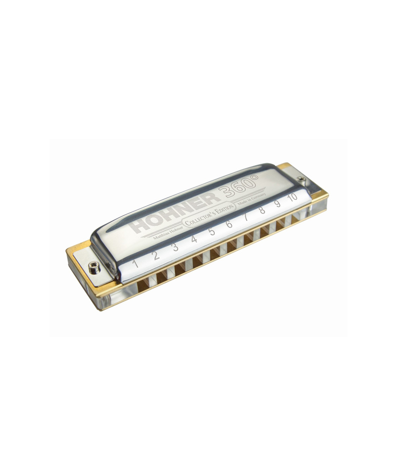 - Hohner 360°: Diatonica, corpo in ABS transparente, 20 ance in ottone, 10 fori, cover in acciaio, 1 ottava completa in Do maggiore