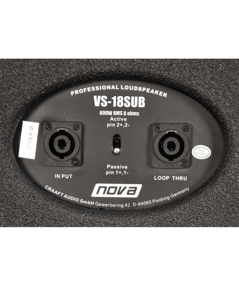 VS18 SUB è un subwoofer passivo per installazioni fisse e mobili. Il cabinet rettangolare è dotato di un wooferi da 18" Hi performance. Molto flessibile, è ideale per parlato e applicazioni musicali come subwoofer in sistemi di amplificazione. Il telaio è costruito in multistrato di betulla da 15 con finituranero NOVA Polycoat©. Il cabinet è dotato di due maniglie e una griglia anteriore metallica ricoperta in schiuma di carbone. Due connettori speakon (NL4) sono montati sul lato posteriore del telaio per l'ingresso di segnale (input) + (link) o uscita del segnale per un diffusore satellite se si utilizza il filtro passivo integrato. La potenza del VS18SUB è 800W (RMS) su 8 ohm.