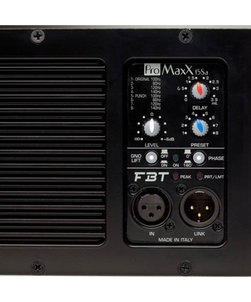 Subwoofer attivo passa banda; altoparlante B&C custom da 15" al neodimio; amplificatore in classe D da 1200 W RMS con alimentatore switching; SPL max 136 dB; risposta in frequenza 38 Hz-120 Hz; dispersione omnidirezionale; processore DSP con 8 presets di equalizzazione, 2 risposte con 4 frequenze di taglio diverse; supporto per stativo M20; 2 maniglie in alluminio FBT. Peso netto 31 Kg