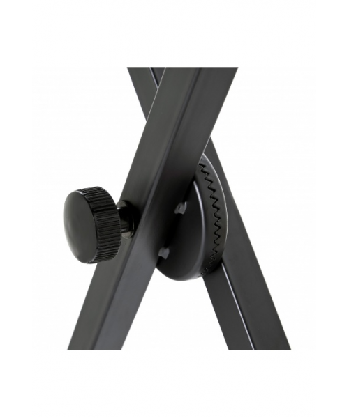 Supporto per tastiera a "X" con meccanismo di regolazione a disco dentato in acciaio e manopola. Tubi 25x25 mm e quattro piedini livellanti.