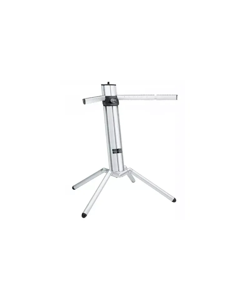 Dotato di una coppia di bracci di supporto telescopici ed estensibili, offre una regolazione dell’altezza infinitamente variabile tramite elementi di bloccaggio ergonomici e una regolazione graduale della profondità. Il supporto include un connettore filettato da 3/8" o 5/8" per il fissaggio di aste microfoniche e un pratico serracavo integrato per una gestione ordinata dei cavi. Può essere facilmente collassato in un unico pezzo per il trasporto e, grazie agli accessori opzionali, permette di aggiungere un secondo livello per una seconda tastiera (bracci 18865/18866) e la valigetta 18846 per il trasporto.