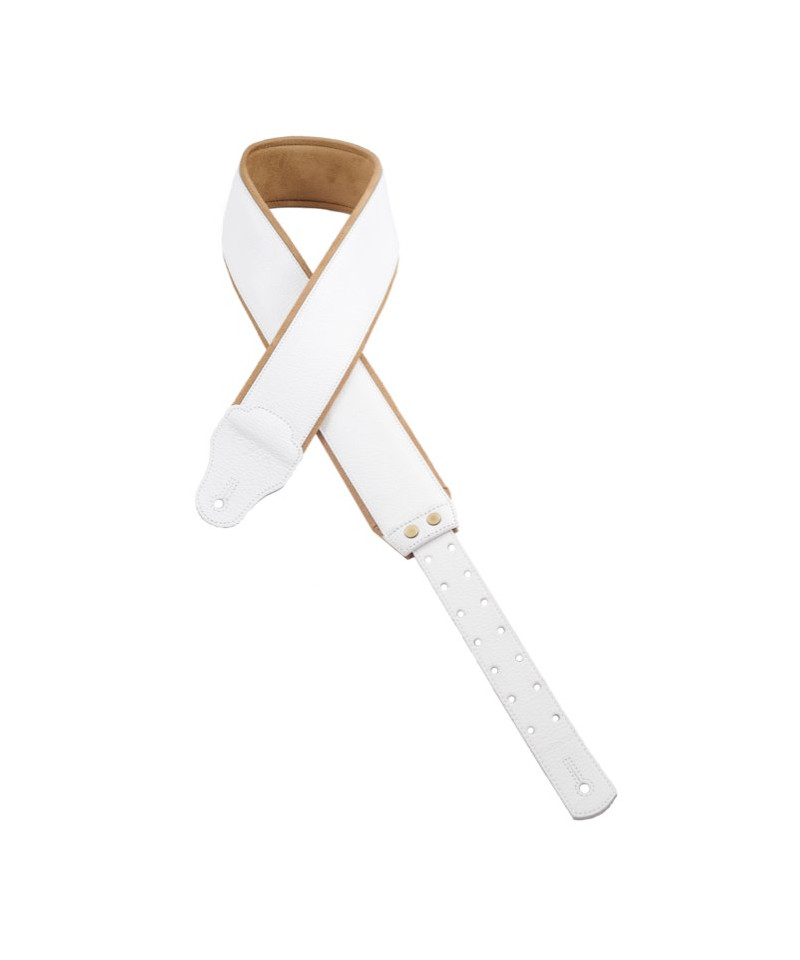 Tracolla in pelle di alta qualità realizzata su richiesta speciale del chitarrista e compositore Graham Foster, con imbottitura in lattice rivestito con microfbra, estremità in pelle sintetica di alta qualità, sistema di regolazione RAS, porta plettri incorporato. Colore bianco, larghezza 7 cm, lunghezza regolabile da 95 cm a 150 cm. Indicata per chitarra e basso.