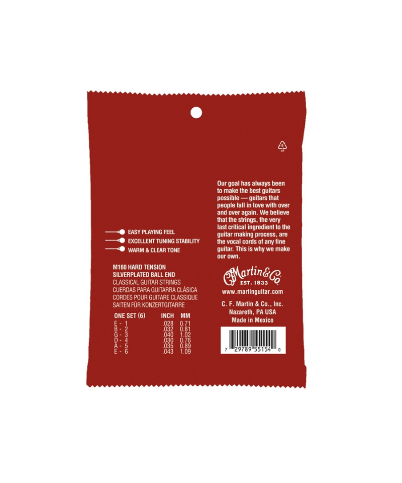 M160 è la muta di corde tensione forte per chitarra classica di Martin & Co, costruita in Crystal Nylon Silver Plated con tecnologia Ball End per facilitare e velocizzare la sostituzione delle corde, offre eccellente stabilità di accordatura e un timbro caldo e pulito.