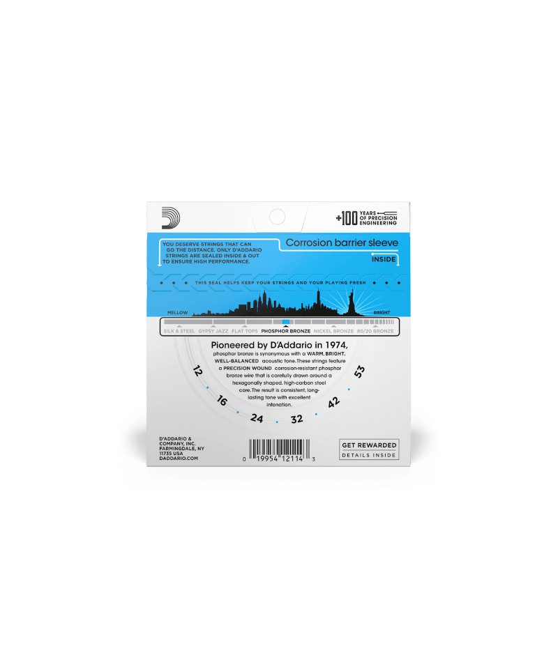 Le corde D'Addario al bronzo fosforoso per chitarra acustica sono acclamate in tutto il mondo per il loro suono superbo e duraturo. Il bronzo fosforoso è stato introdotto da D'Addario nel 1974 ed è diventato sinonimo di un timbro acustico caldo, luminoso e ben equilibrato.