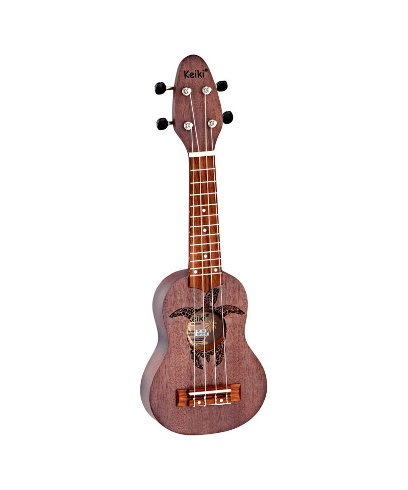 Ukulele Sopranino Keiki K1-MM. (più piccolo del soprano, scala 248mm). Finitura in carbone satinato. Corpo e manico in okume, tastiera e ponte in nogal. Top in okume con incisione a laser di una tartaruga. Meccaniche nere cromate. Monta corde Ortega UWNY--4-SO per soprano standard.
